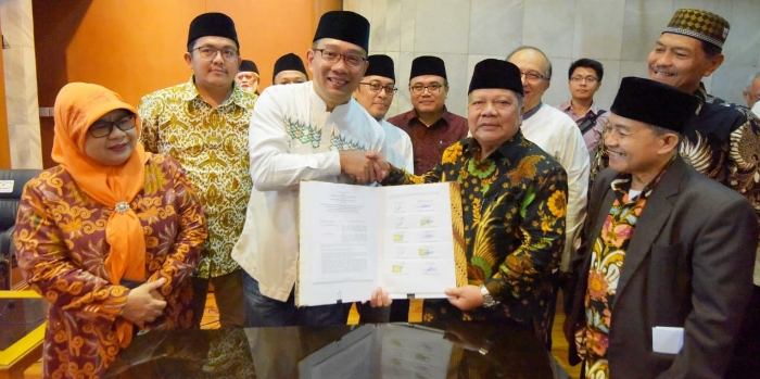 Gubernur Ridwan Kamil bersama Ketua Umum PP Persis KH Aceng Zakaria menandatangani naskah Perjanjian Hibah disaksikan ribuan jemaah Pengajian Rutin Ahad, di Masjid PP Persis, Kota Bandung, Minggu (8/3/2020),